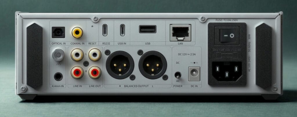 Digital inputs include optical and coaxial, plus local playback via USB storage, while balanced is on the menu alongside single-ended on its analogue side.