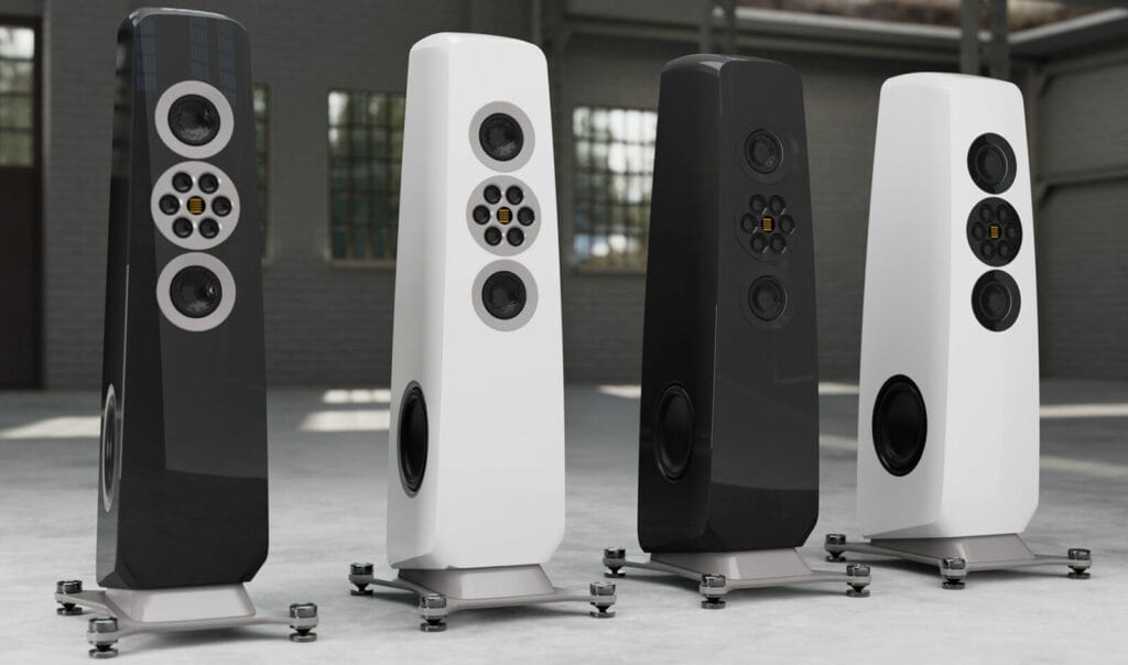 Other key features include dual 250mm aluminium sandwich woofers with impulse compensation, high-grade crossover components including film capacitors, air coils, MOX resistors and high-gloss cabinet finishes in black or white, with premium aluminium accents.