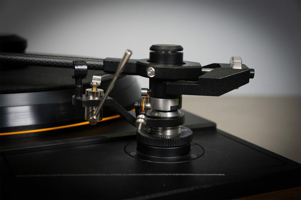 Tonearm pillar allows for a range of adjustments including azimuth, vertical tracking angle (VTA), overhang and anti-skate – with the latter using a thread and weight design