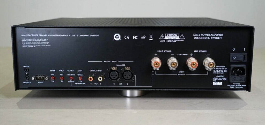 A35.2’s rear panel toggle switches for ‘sense’ on/off, RCA or XLR, two channel or bridged mode and a +6dB gain option (when bridged), alongside analogue inputs and two sets of quality multiway loudspeaker connecting sockets