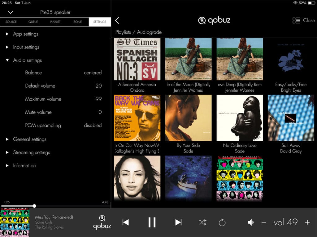 Primare’s Prisma app on my iPad has plenty to see with settings to the left and music to the right. A quick dab of the track tile (left corner) provides track info, including file type, bit-depth and sample rate